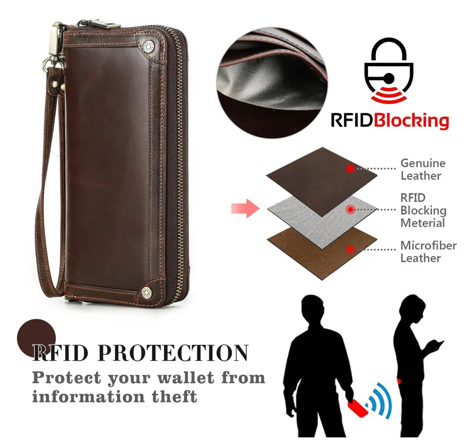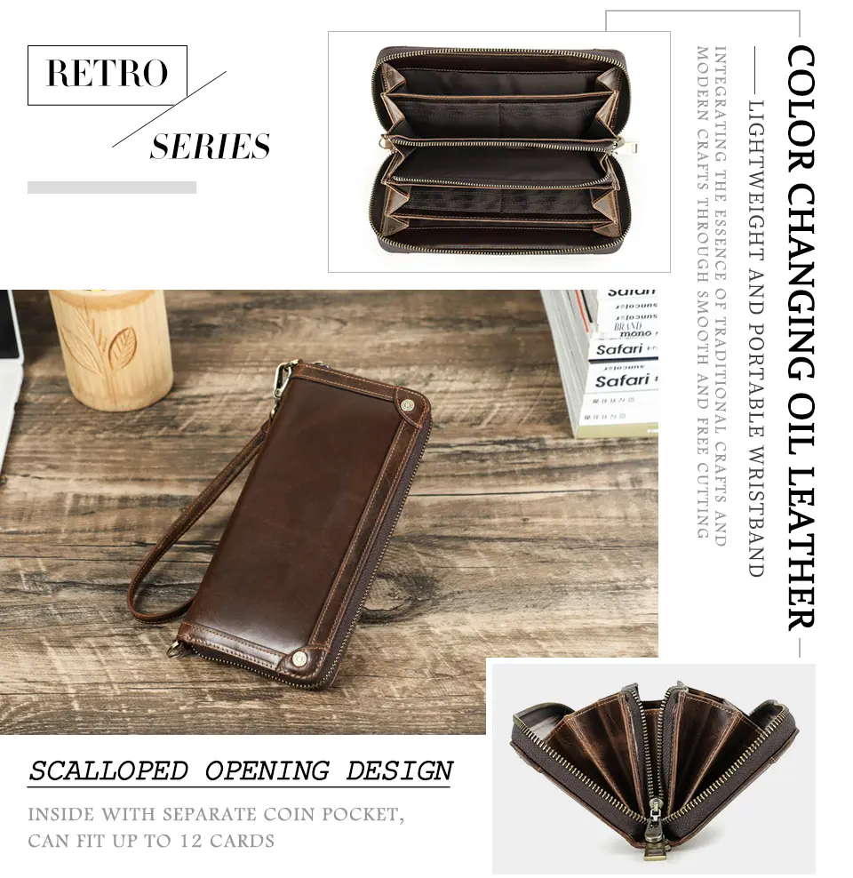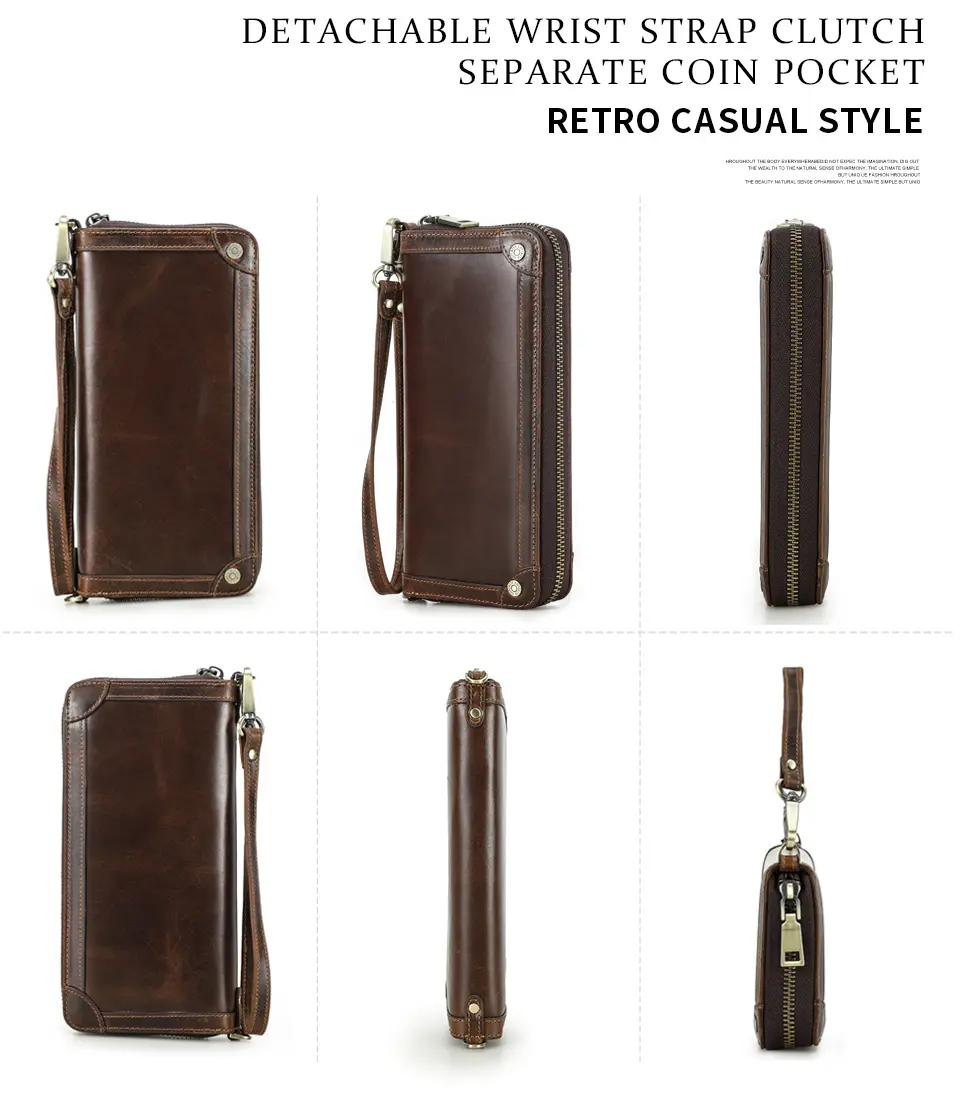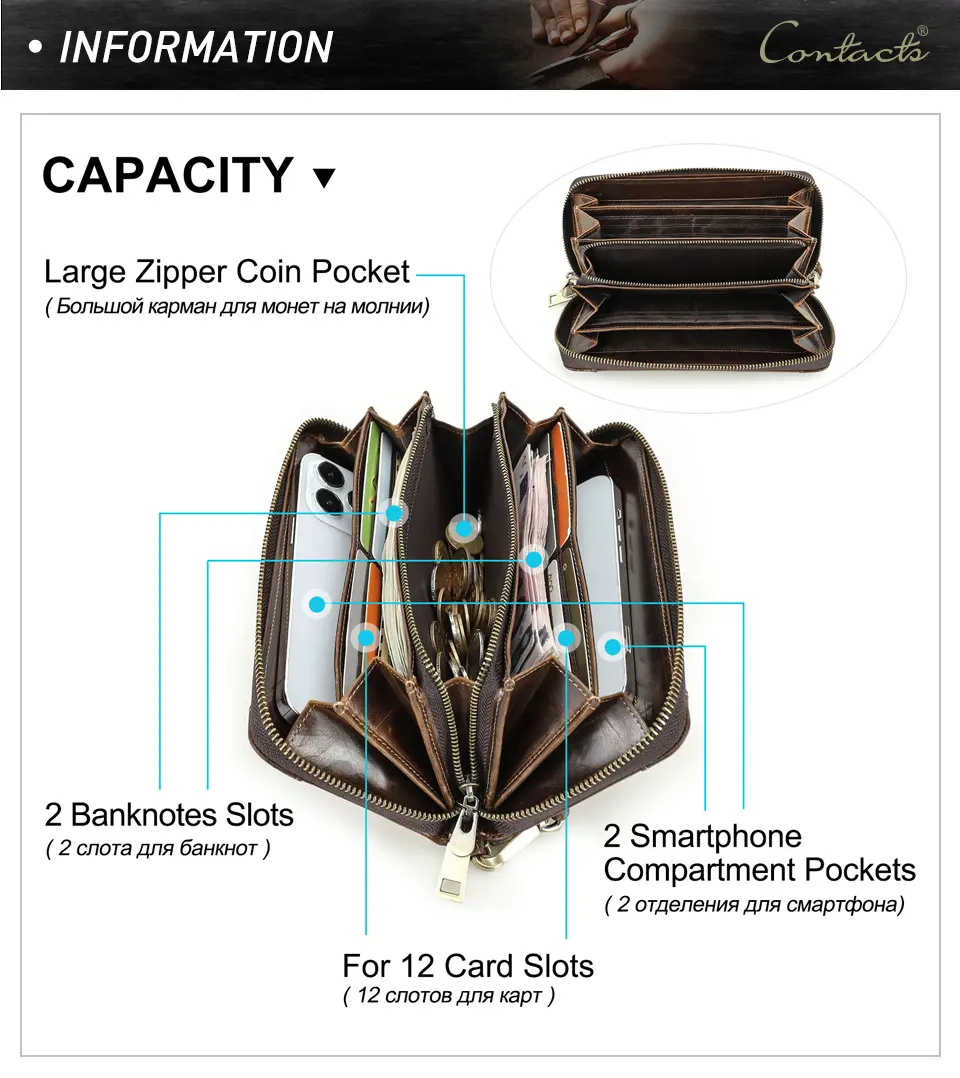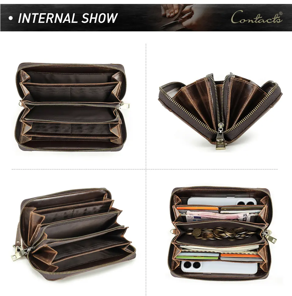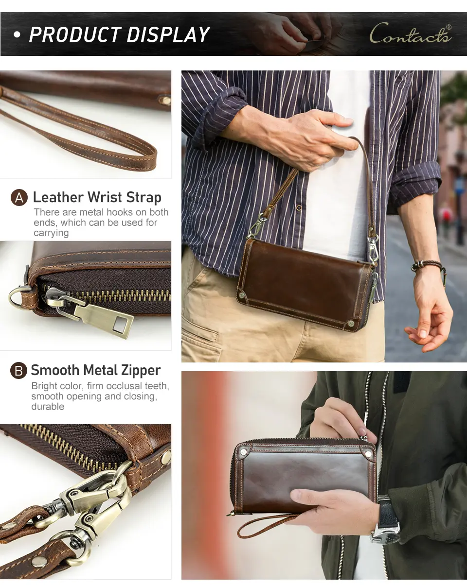 Contact’s Genuine Leather Clutch Bags for Men High Quality Zipper Clutch Wallet Card Holder Money Clip Phone Pocket Handbag Male