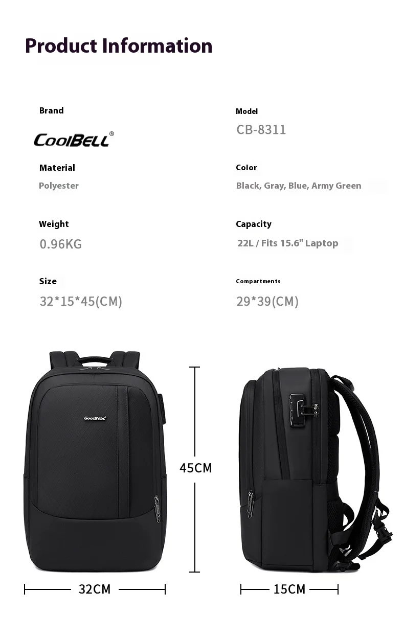 CoolBell Men’s Backpack Fashion Man Computer Bag Large Designer Travel Backpacks 15.6inches Laptop for Male Student Bagpack Sport