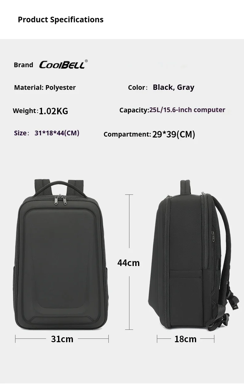 CoolBell 25L Large Capacity PC Hard-side Waterproof Men Backpack For 15.6 inch Laptop 180° Shell Opening