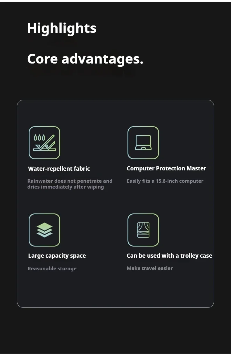 - Capacity: 25L. It can contain 15.6 inch laptop