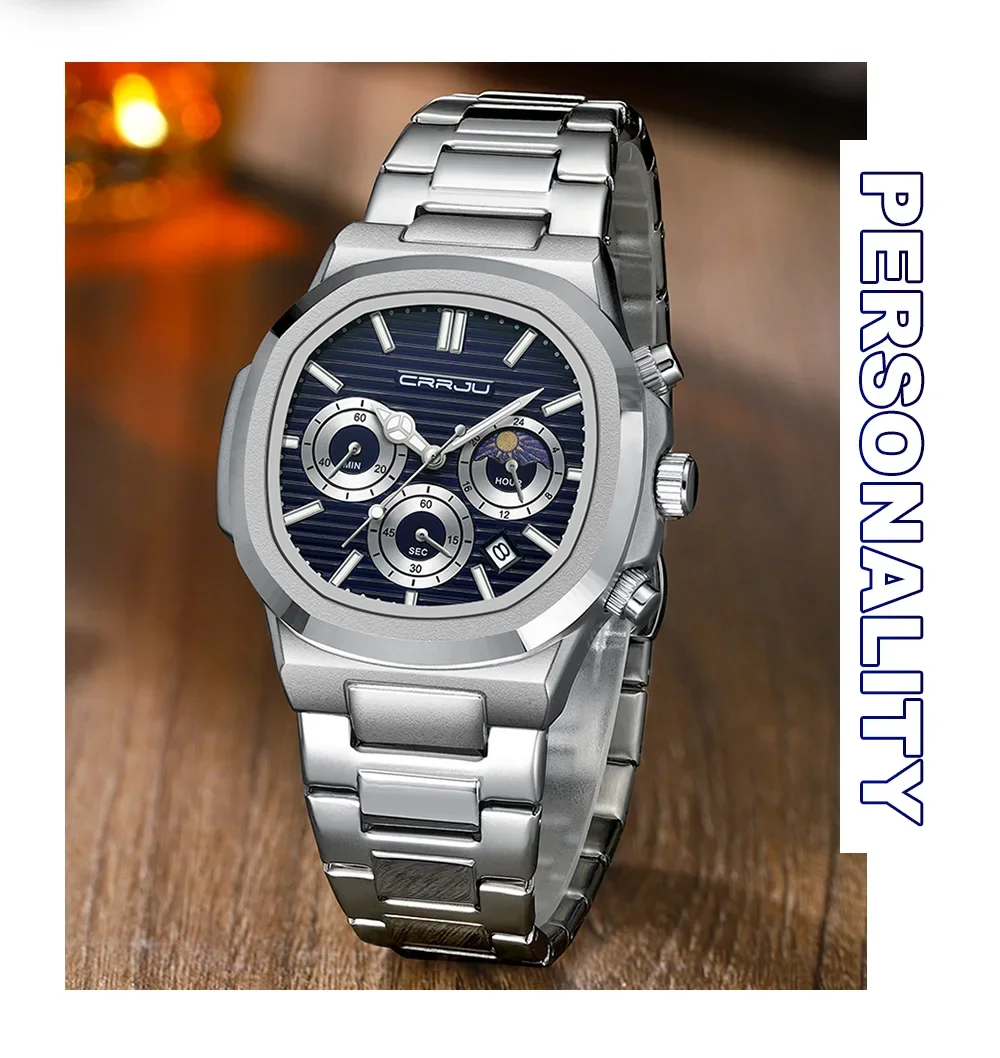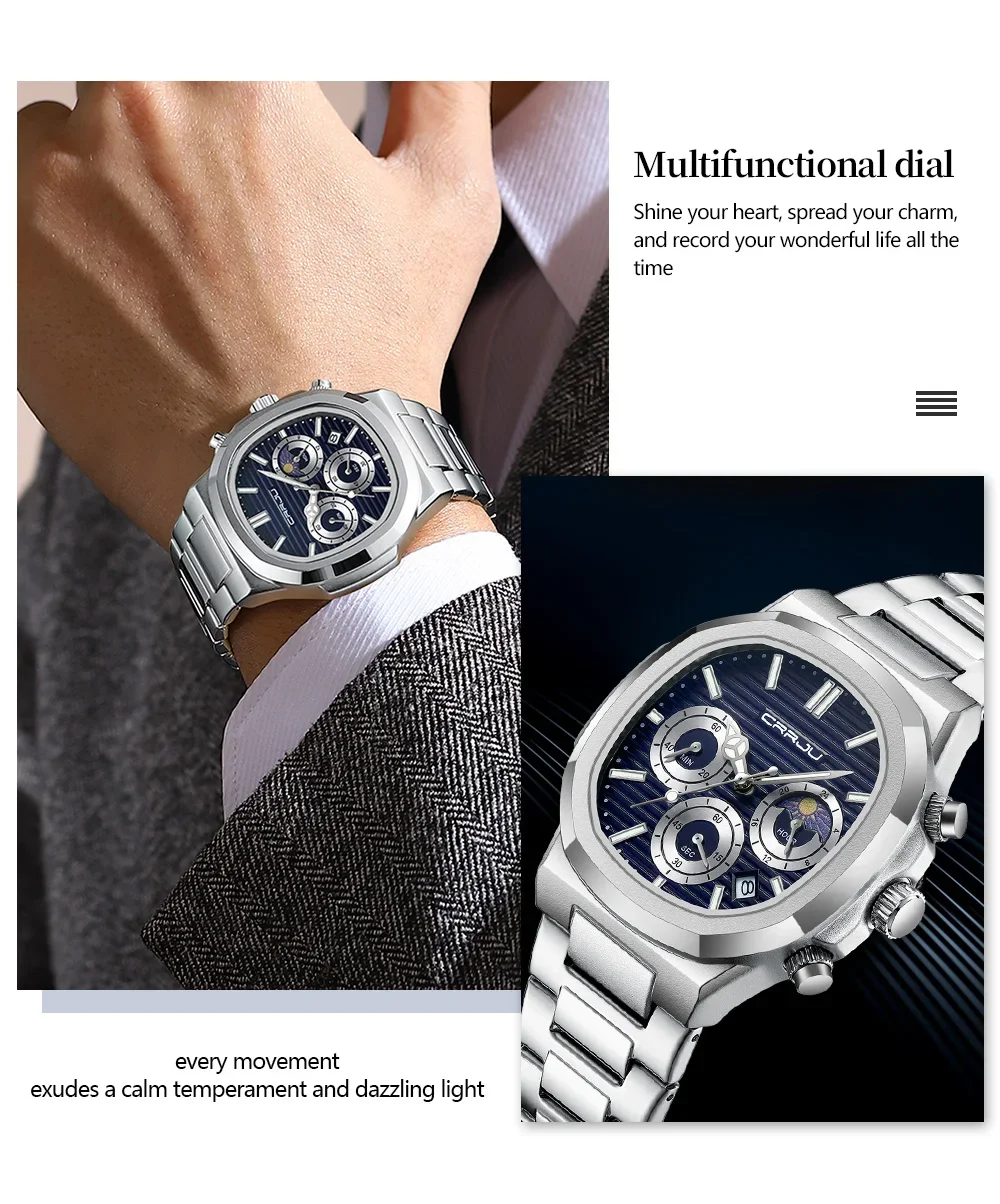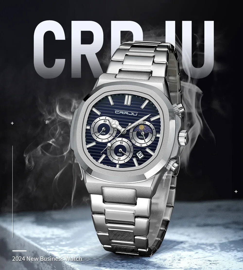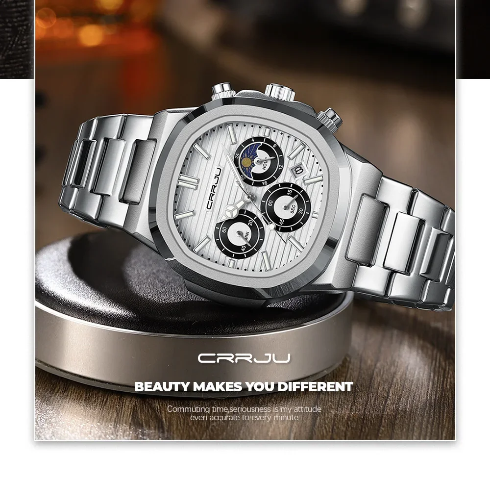 CRRJU Pilot-Style Men’s Watch – Durable Stainless Steel Band, Luminous Display, Waterproof 3ATM Quartz Wristwatch