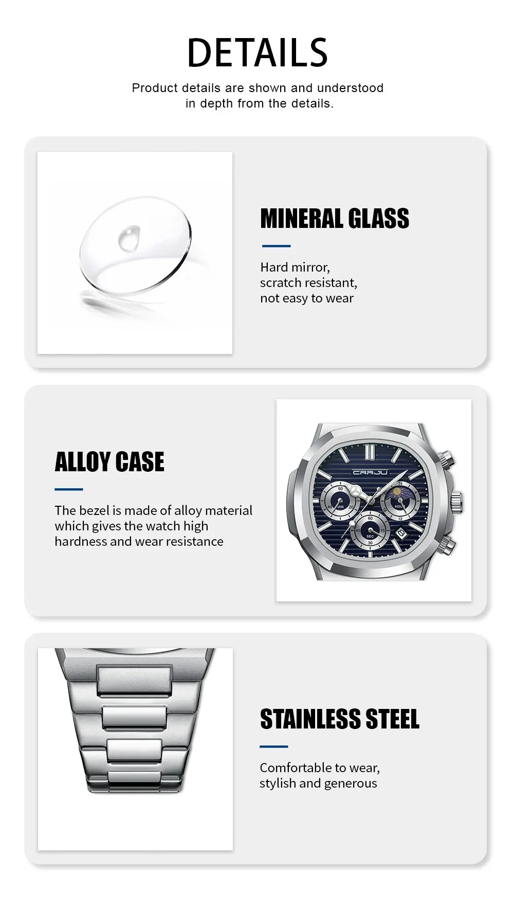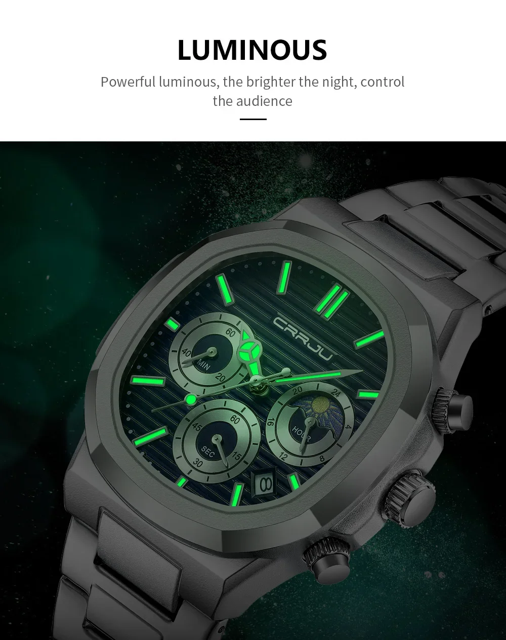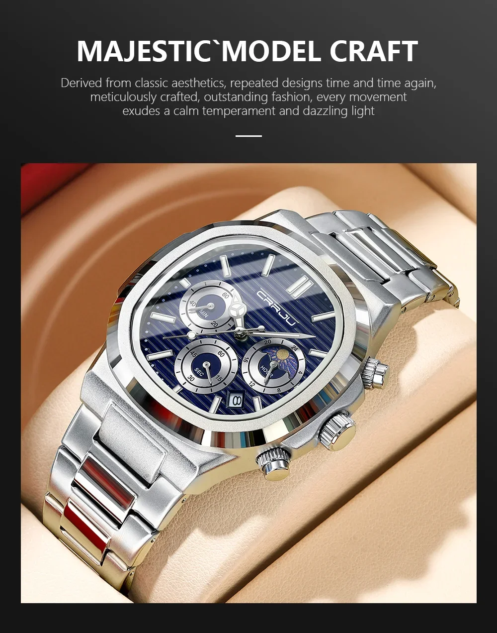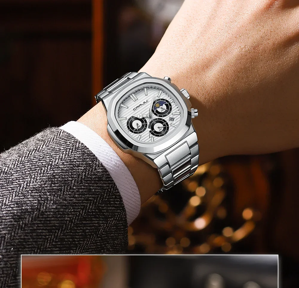 CRRJU Pilot-Style Men’s Watch – Durable Stainless Steel Band, Luminous Display, Waterproof 3ATM Quartz Wristwatch