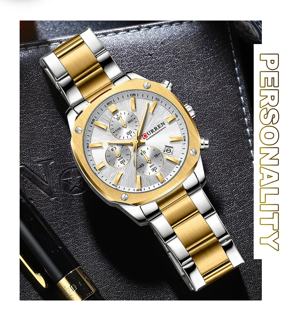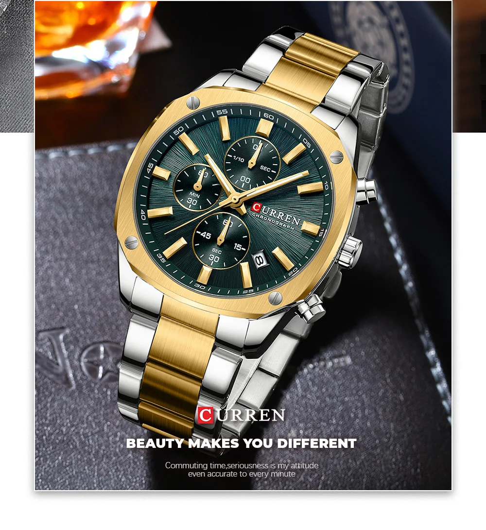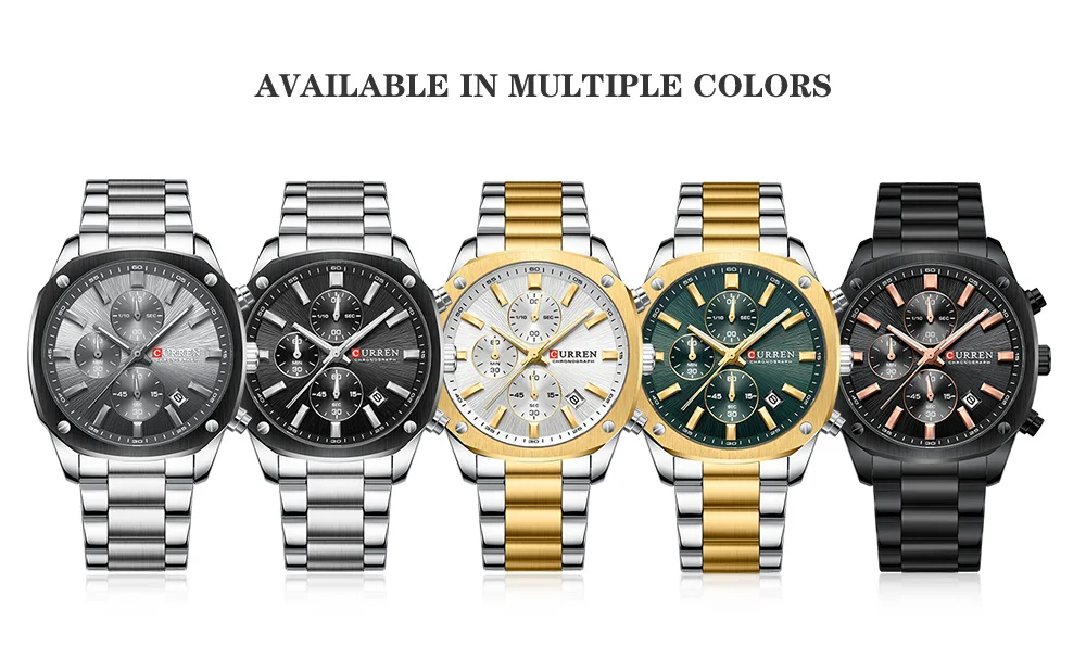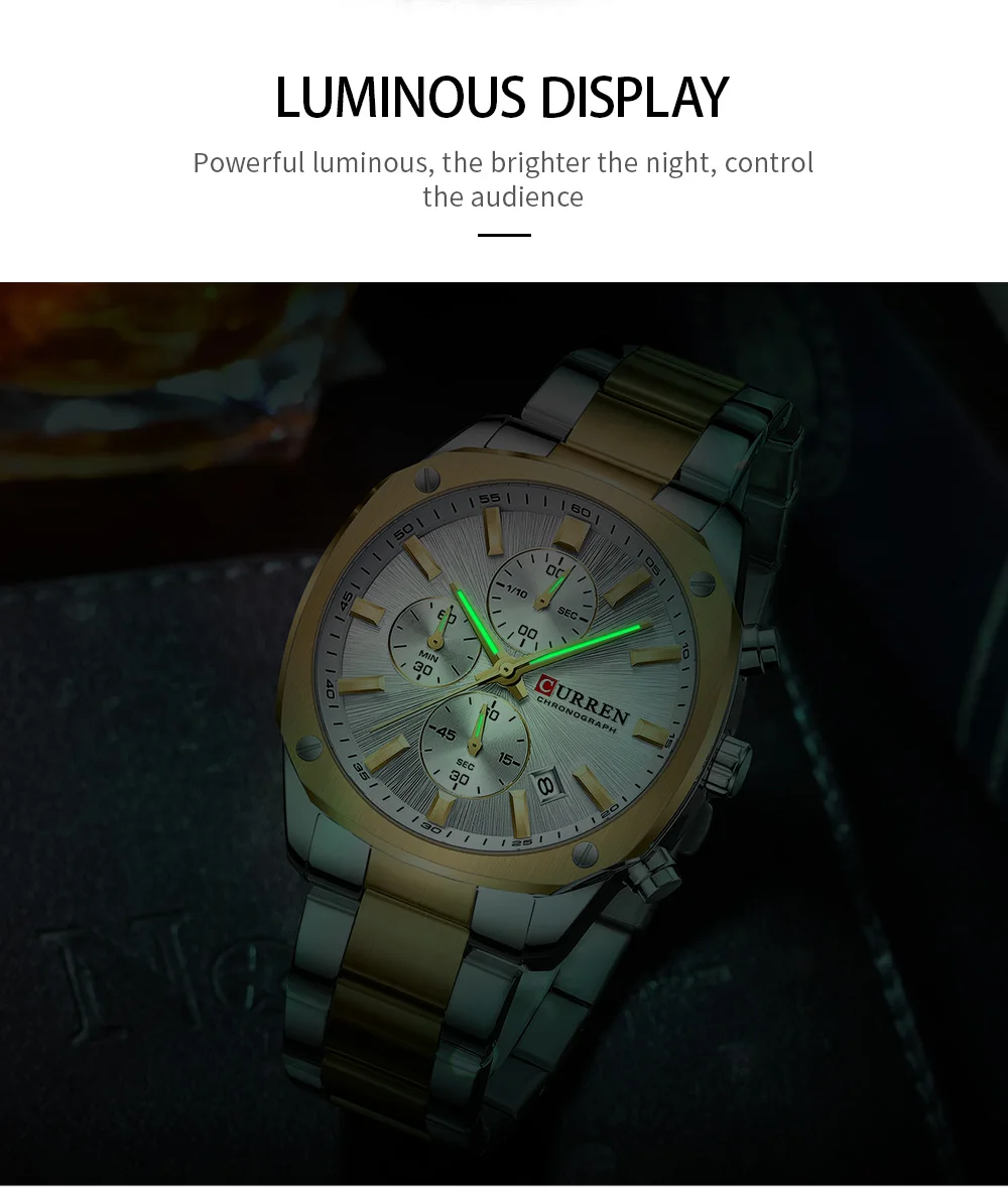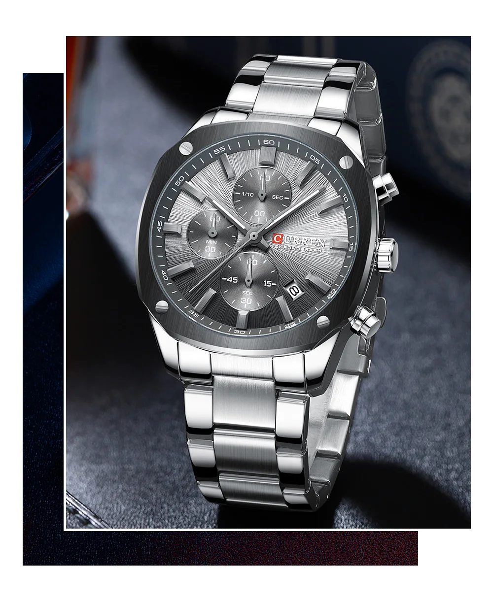 CURREN Business Sport Chronograph Watch for Men – Stainless Steel Band, Luminous Hands, Numberless Dial, Quartz Movement, Auto Date, 3Bar Water-Resistant