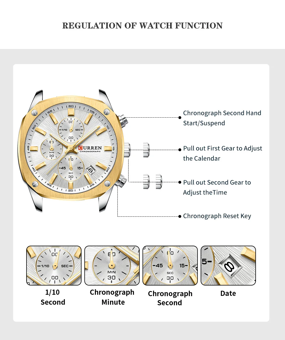 - Functions: Chronograph, Auto Date, Luminous hands