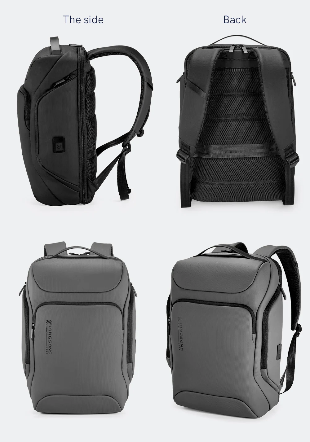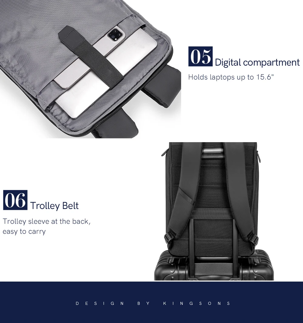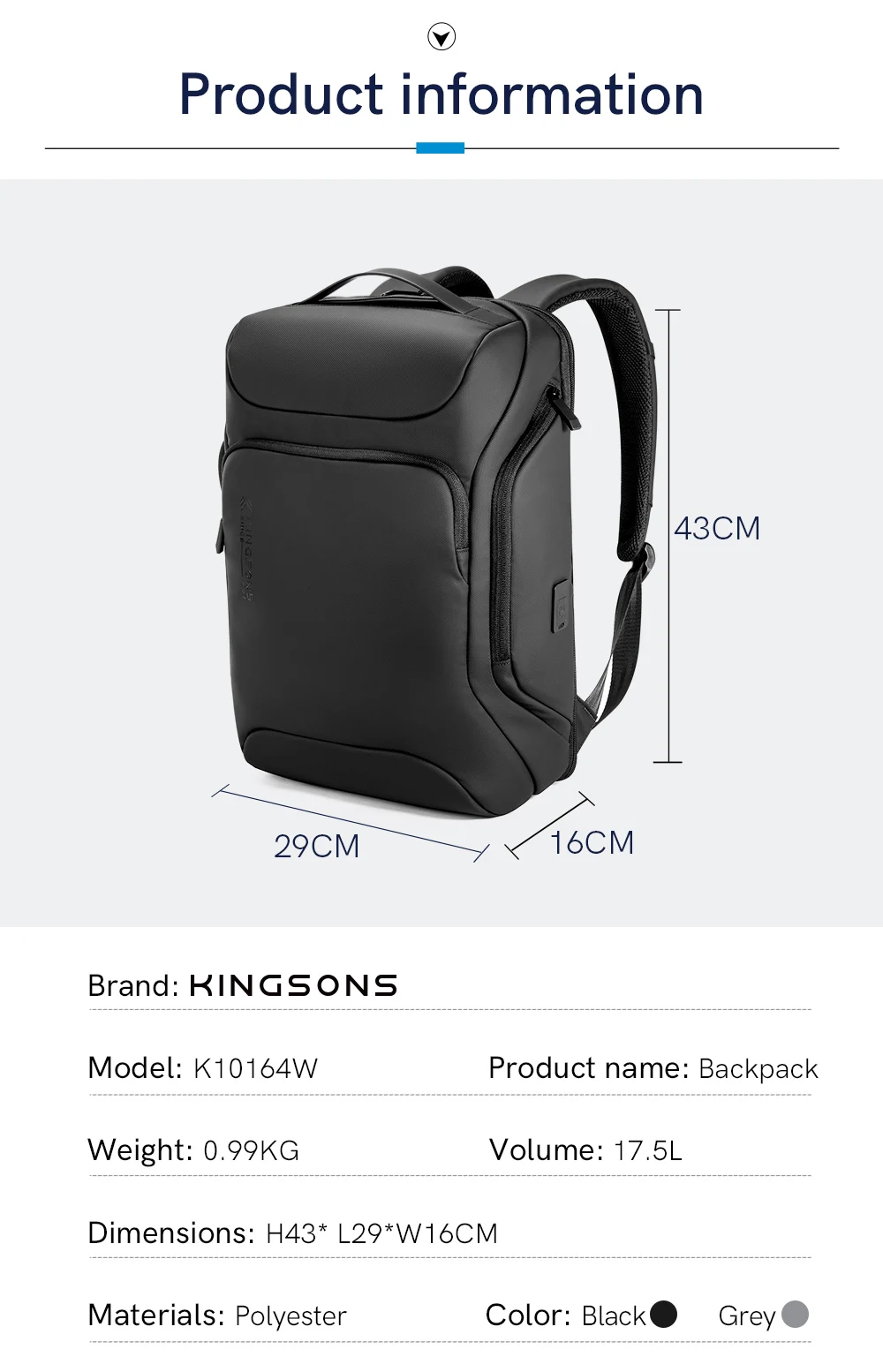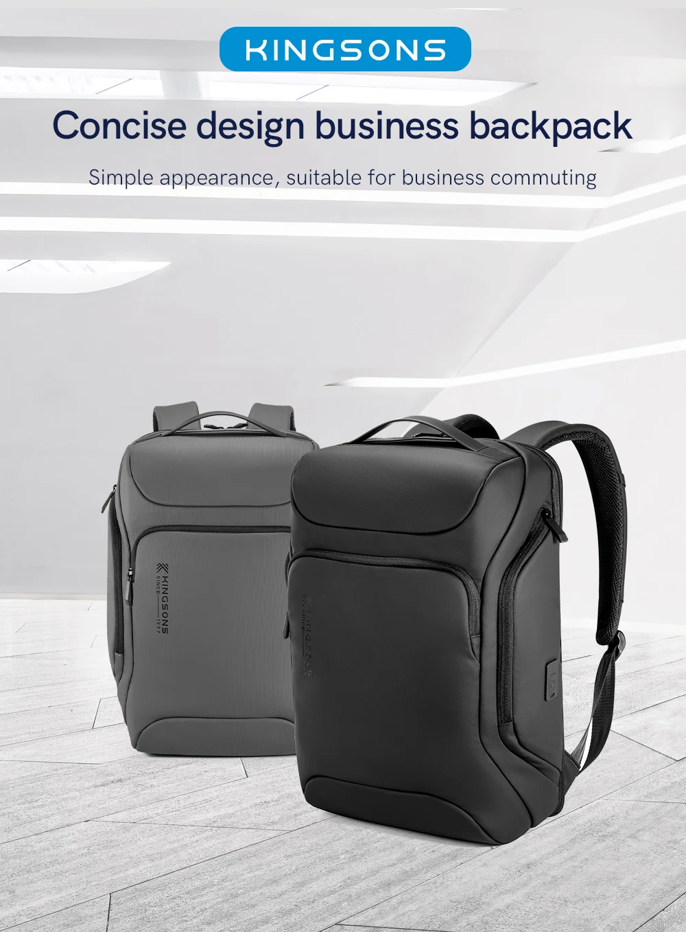 Kingsons Business Backpack For Men 15.6 inch Laptop Concise Design 180° Open Up USB-A Fast Charging Port Waterproof Black