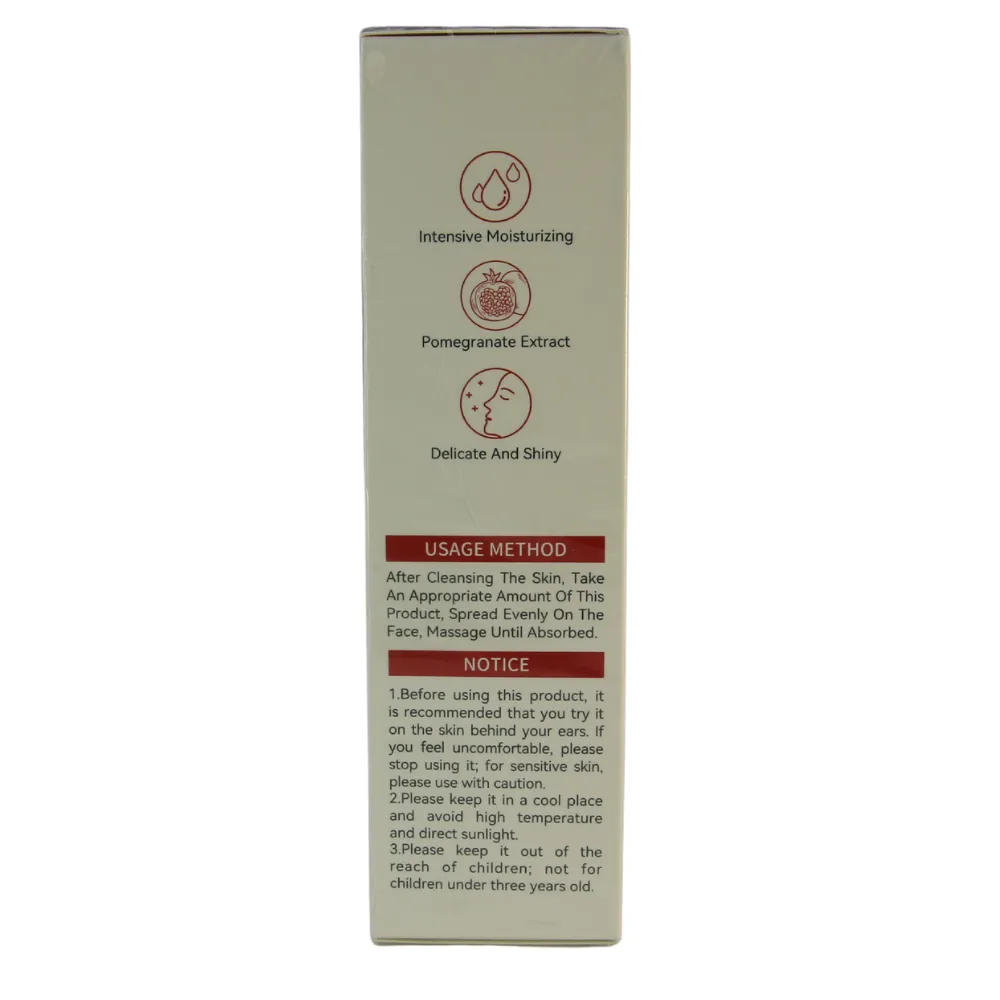 Description: Texture is soft and silky, easy to absorb. Contains Red Pomegranate Extract and other skin care ingredients, moisturizing care, moisturizing and brightening the skin, leaving the skin smooth, smooth and elastic.