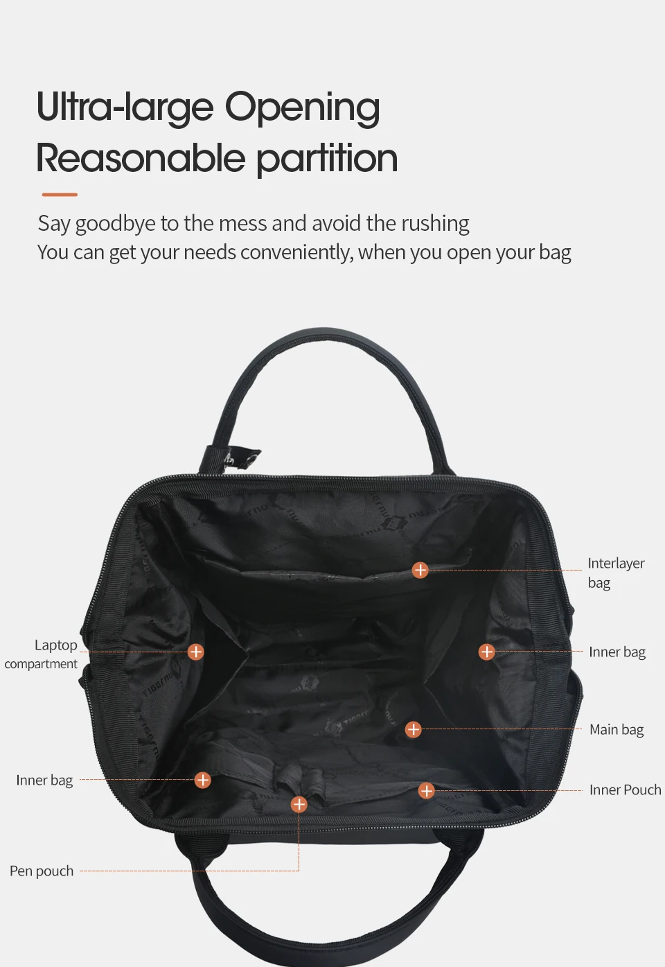 - Other convenient details: ultra-large opening, snap latching handle, adjustable shoulder strap buckle, and more.