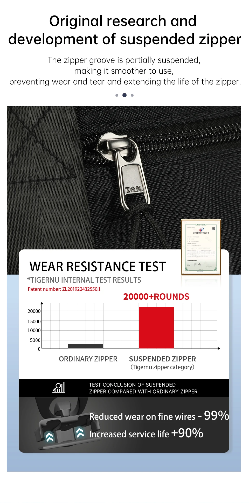 - Brand patent innovative zipper, suspended design zipper, reduces friction, longer lifetime; 10-year warranty zipper.