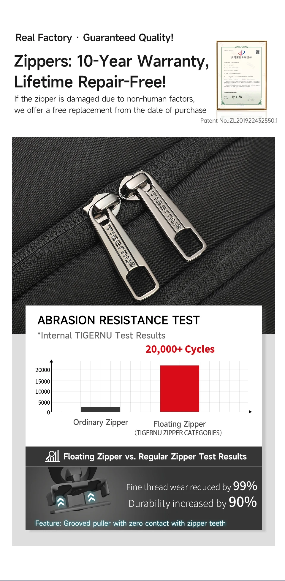 - Brand patent innovative zipper, Suspended design zipper, 10-year warranty zipper, reduce friction, longer life time